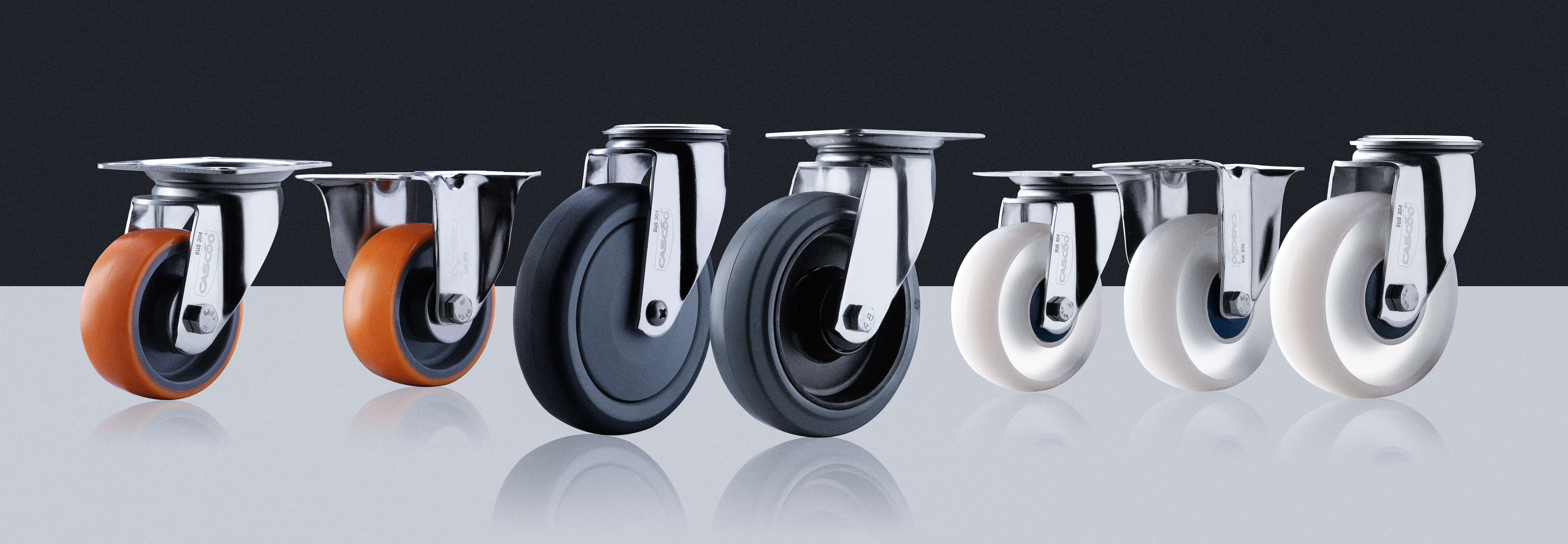 Vi har ett sortiment av bl.a. länkhjul, fasthjul, hjul av nylon, plasthjul, apparathjul, hjul för tung last, gummihjul, rostfria hjul, möbelhjul, hjul för avfallsbehållare, hjul för vagnar och hjul för kundvagn.